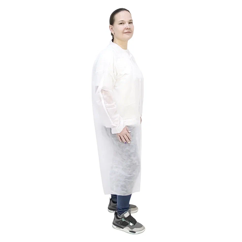 Халат одноразовый на кнопках, предназначенный для посетителей, изготовлен из проницаемого для воздуха первичного нетканого полипропилена, обеспечивающего комфорт при носке и поддержание гигиены. Этот материал является идеальным выбором для одноразового использования благодаря своим защитным и гигиеническим свойствам.