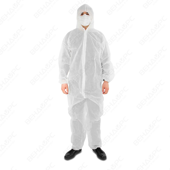 Комбинезон для работников изготовлен из воздухопроницаемого первичного нетканого полипропилена. Он представляет собой комбинезон из спанбонда, который обеспечивает комфорт и защиту в различных условиях. Спереди комбинезон оснащен застежкой молнией, что облегчает его надевание и снятие. На запястьях, внизу штанин и на капюшоне вшиты утягивающие резинки для дополнительного удобства и плотного прилегания.