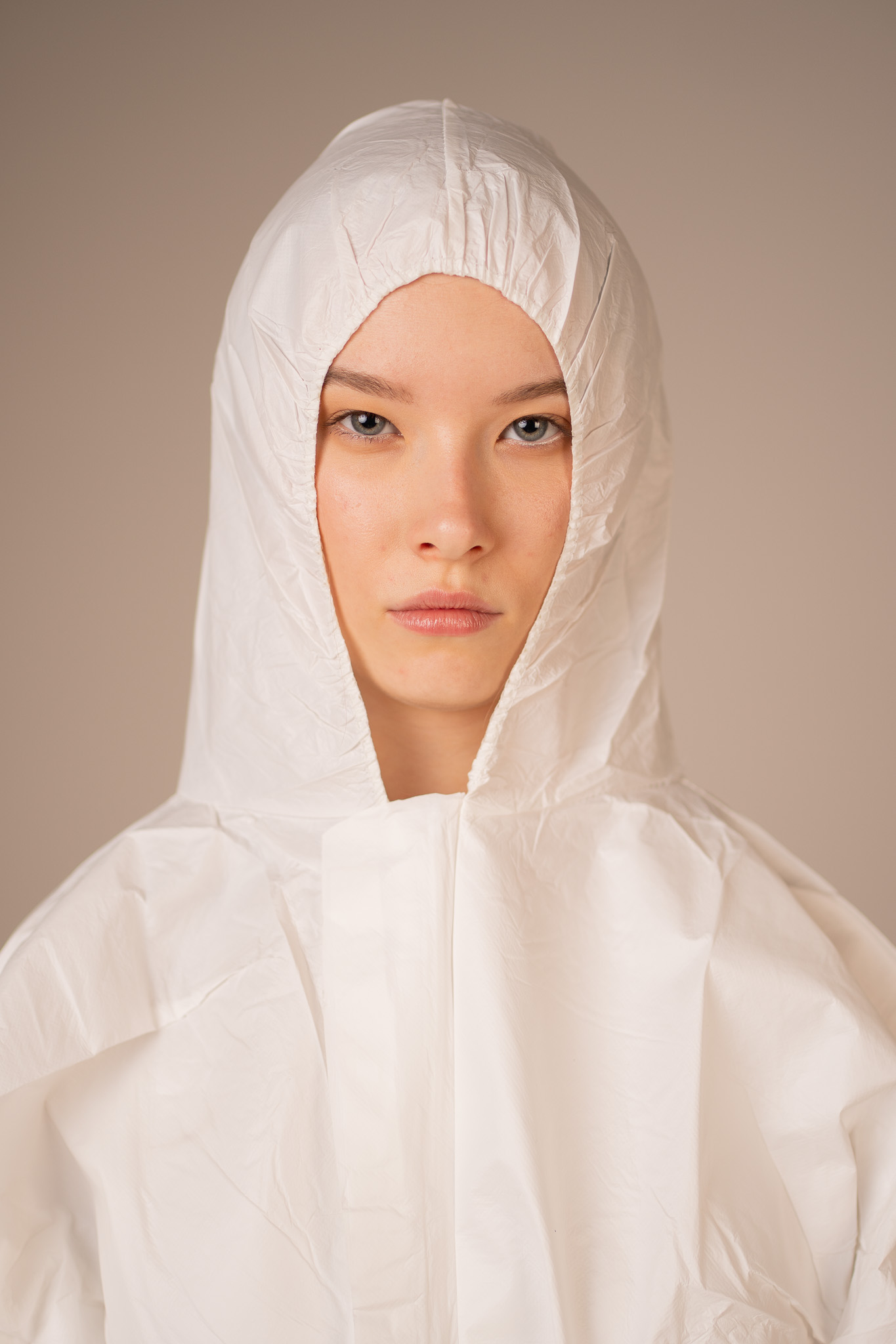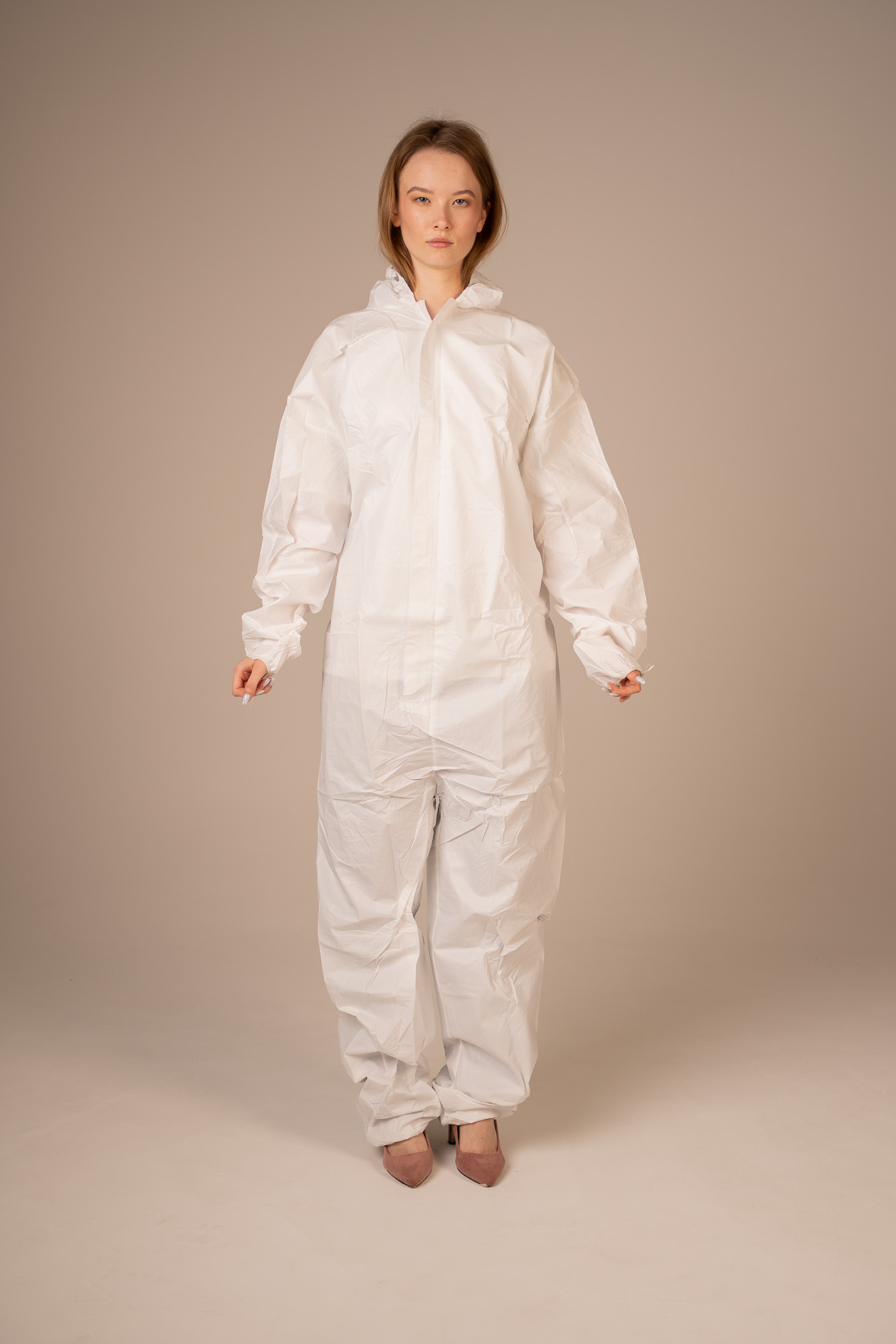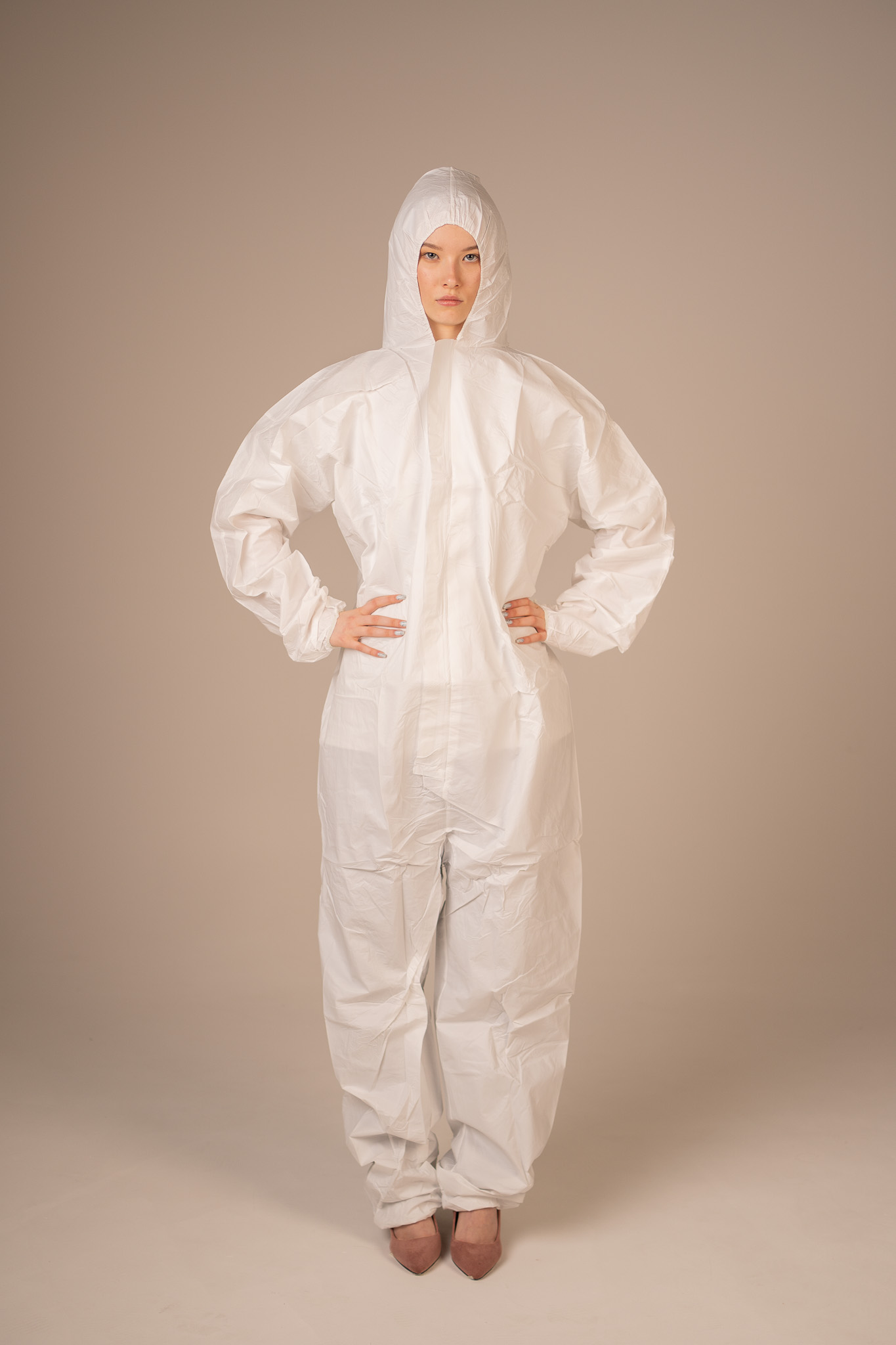 Комбинезон изготовлен из ламинированного микропористого спанбонда. Этот материал отличается превосходными защитными свойствами и устойчивостью к химическим веществам, предотвращая проникновение жидких химикатов и различных растворов. Впереди он оборудован застежкой на молнии, покрытой сверху липкой лентой для дополнительной герметичности.