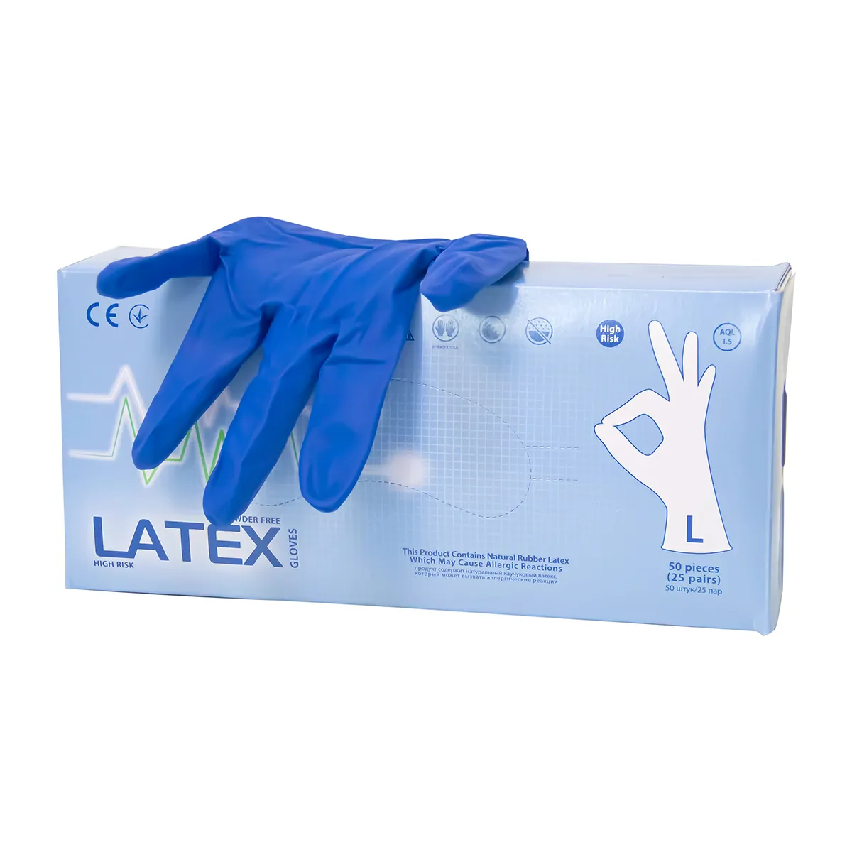 Перчатки немедицинские смотровые (неанатомические), HIGH RISK повышенной прочности, удлиненные, нестерильные, неопудренные, текстурированные на пальцах и на ладонях, из натурального латекса, цвет - синий.