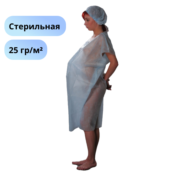 Рубашка для роженицы стерильная изготовлена из спанбонда - мягкого воздухопроницаемого материала, который обеспечивает стерильность и комфорт. Рубашка не имеет рукавов, надевается через голову.