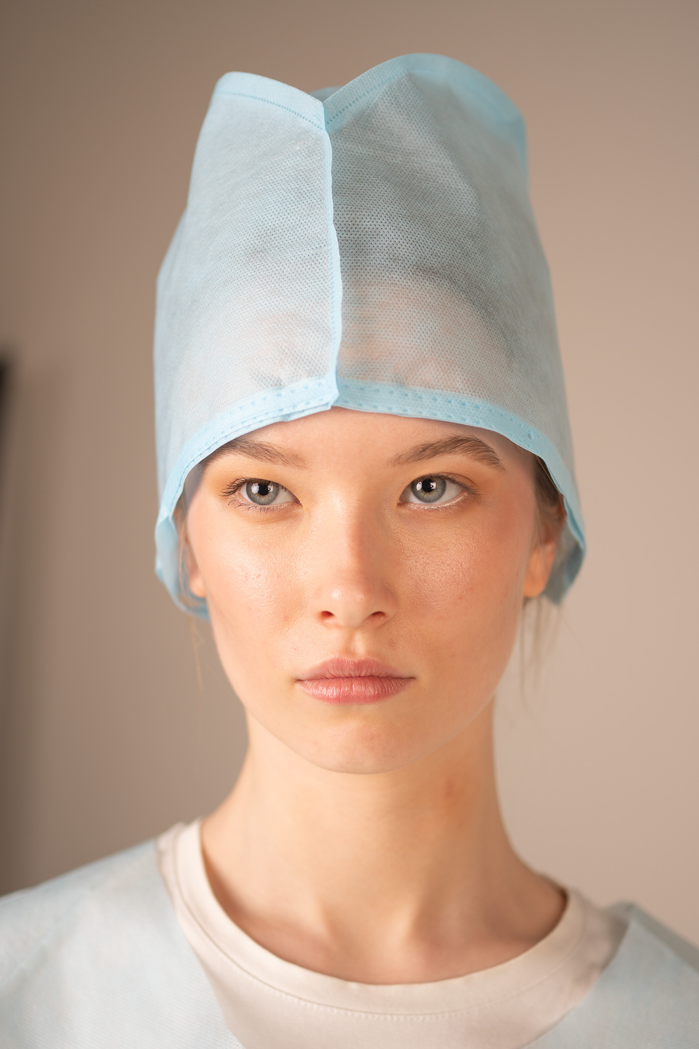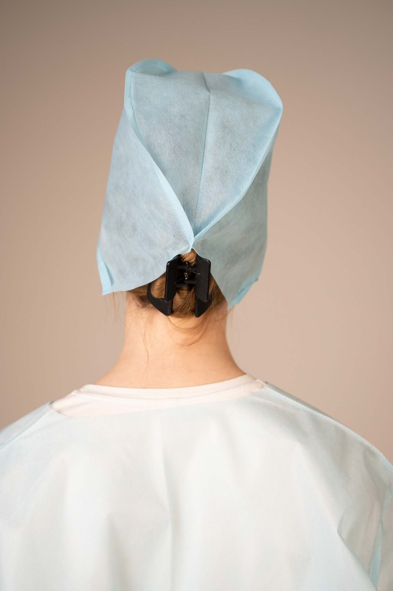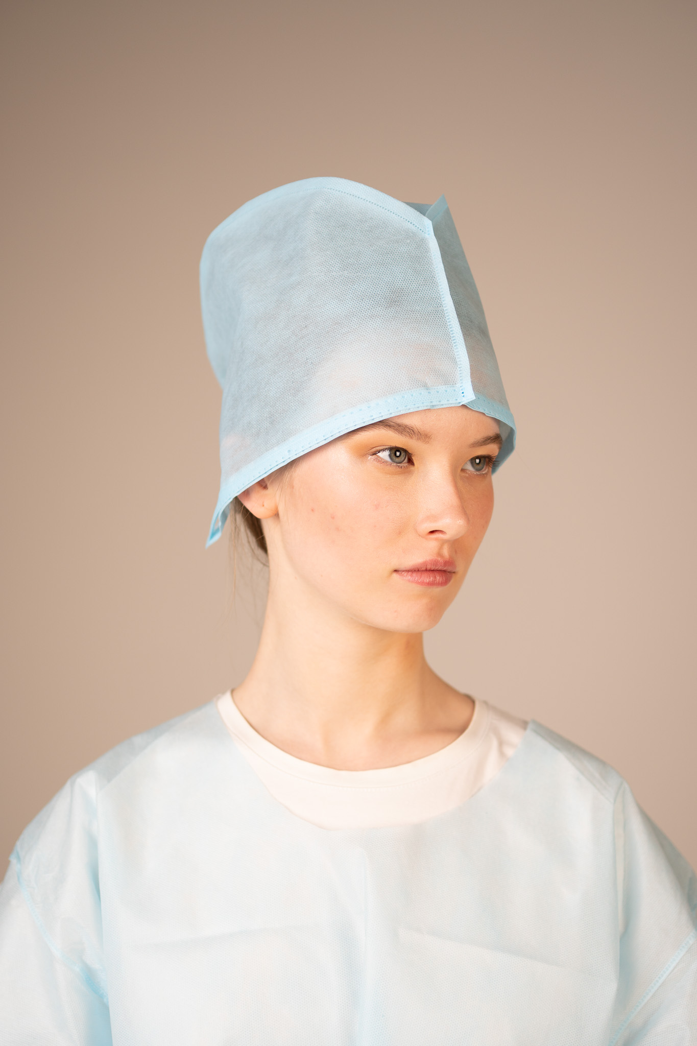 Изделие выполнено сварным швом без применения ниток, что предотвращает возможность проникновения микробов через швы и повышает гигиеничность шапочки. Этот метод изготовления также способствует более плотному прилеганию шапочки к голове, что повышает ее функциональность и надежность. Шапочка дополняет хирургический халат, создавая единый защитный комплект для хирургов и медицинского персонала.