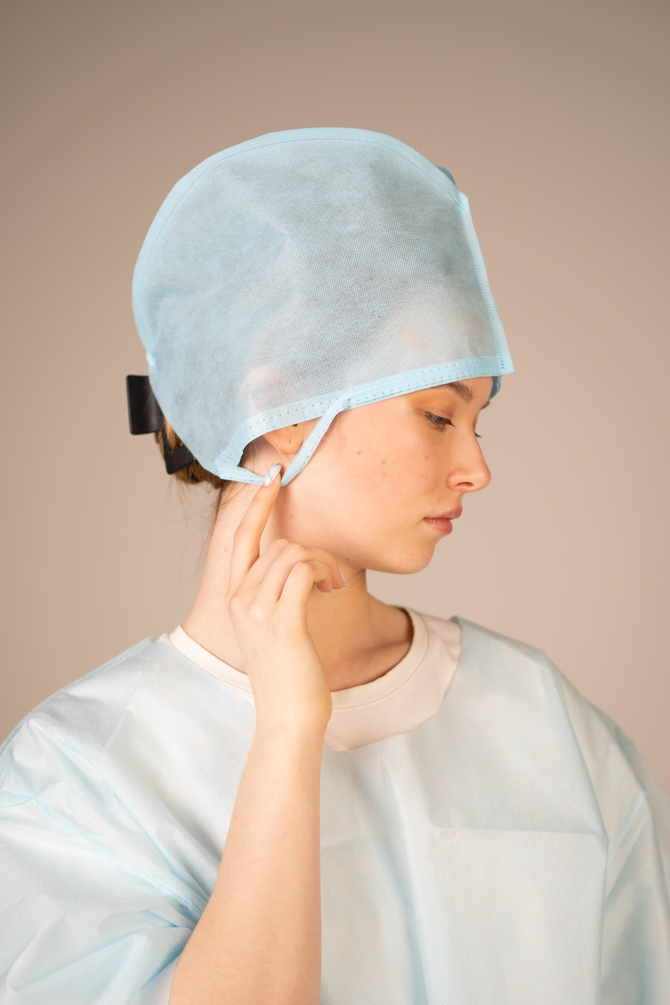 Эта модель представляет собой высокую шапочку с завязками для надежной фиксации на затылке. Завязки обеспечивают комфортную посадку и позволяют регулировать размер, что делает шапочку универсальной и удобной для людей с различной формой головы. Одноразовый берет подходит под любые прически, не нарушая укладки и обеспечивая удобство использования даже для людей с длинными волосами.